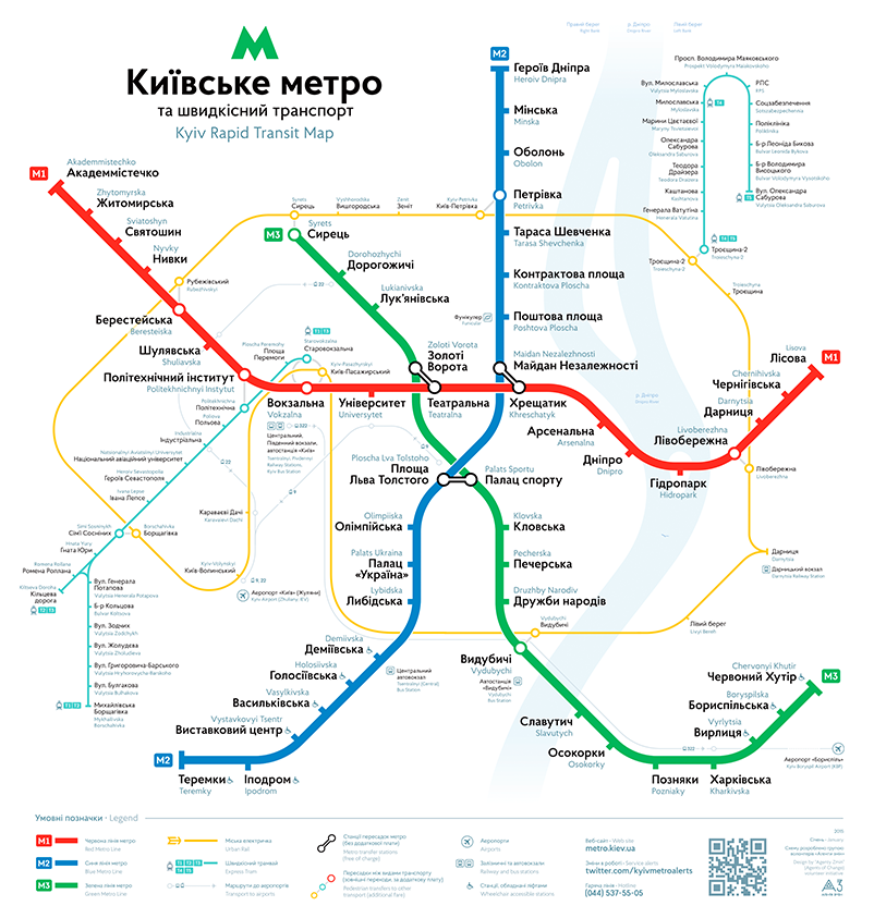 Kyiv metro includes three lines with a total of 43 stations. The left and right banks of Kyiv are connected through the Metro bridge. The Metro is often the fastest and most convenient mode of transport but it can be crowded during rush hours between 7-9am and 5-7pm. |